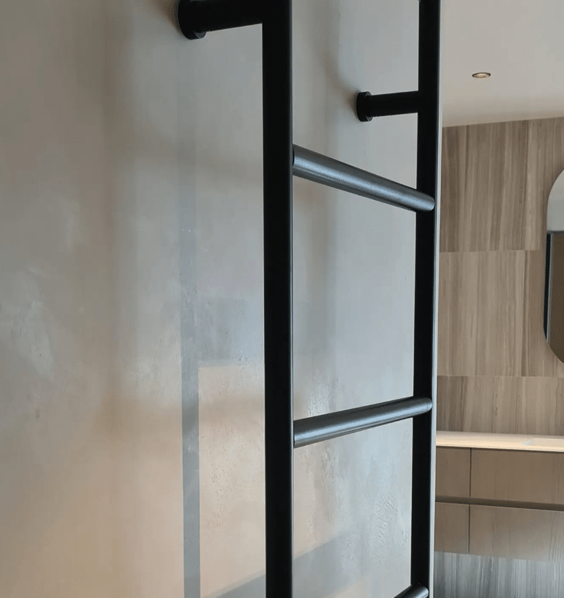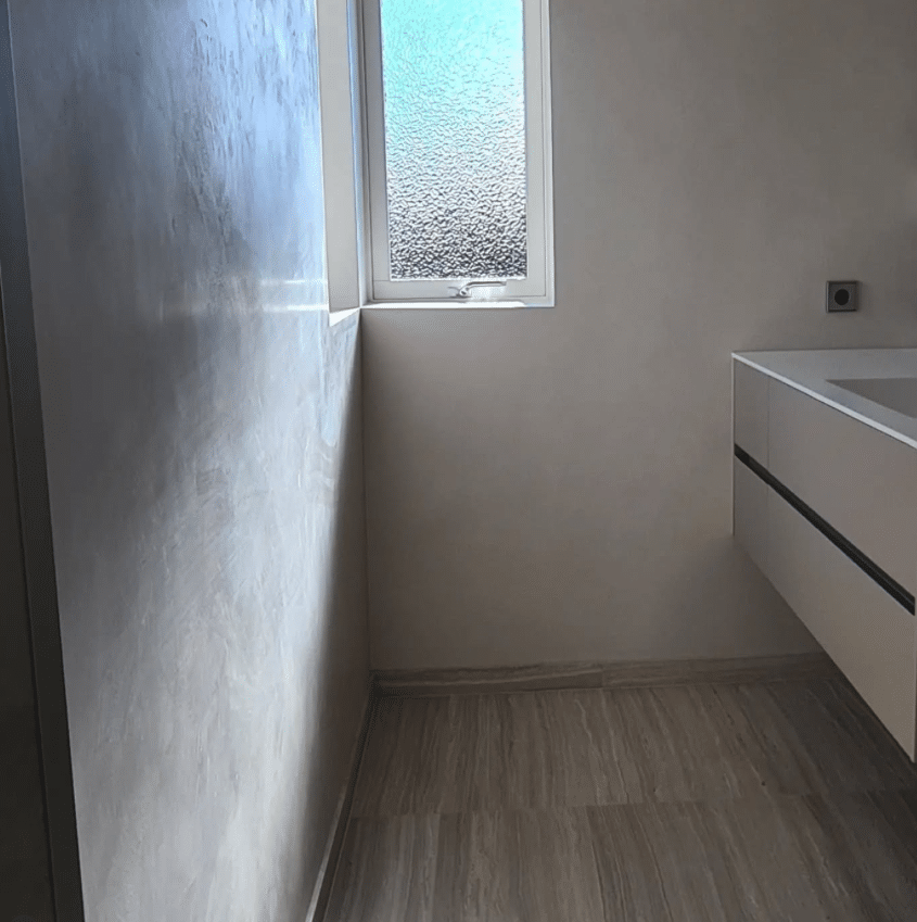 Tadelakten applicerades för hand på väggarna i samtliga tre badrum. Den skimrande ytan och djupet i strukturen skapar en elegant variation där varje penseldrag och verktygsrörelse bidrar till helheten. Resultatet gav en putsad yta som känns levande, mjuk och samtidigt exklusiv.