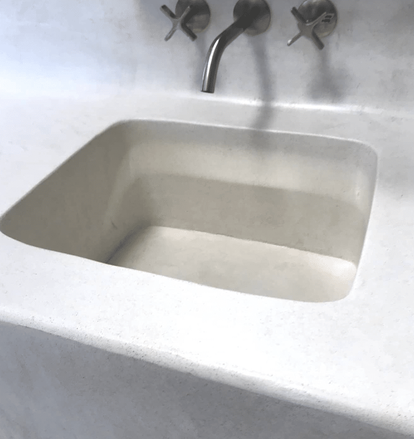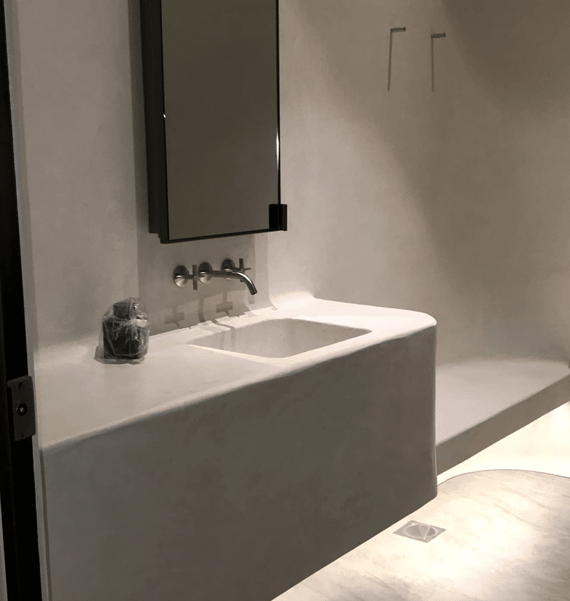 I detta projekt användes tadelakt för att skapa ett badrum där väggar, integrerade tvättställ och sittytor bildar en sammanhängande helhet. Materialets egenskaper gör det möjligt att forma mjuka övergångar och linjer utan synliga skarvar.