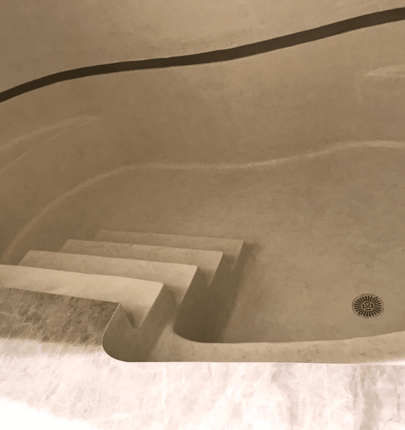 I badrumsdelen skapades en lång, sammanhängande tvättställsyta med flera speglar, där tadelakten binder ihop form och funktion. Den ljusa tonen i putsen låter ljuset röra sig över ytorna och framhäver materialets naturliga struktur. I poolutrymmet skapades inbyggda avsatser och mjuka trappsteg som ger en genomtänkt helhet i rummet. Resultatet blev en lugn och harmonisk miljö med skulpturala former.